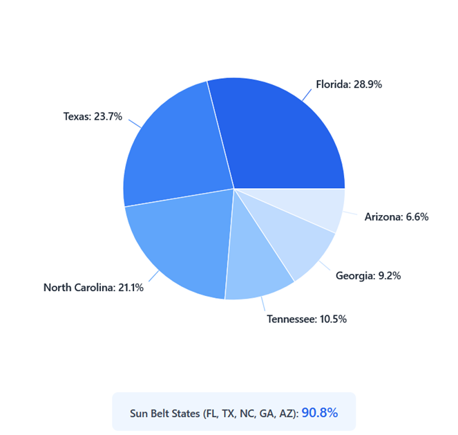 Florida captured 35% of October closings, with Texas, Georgia, the Carolinas, Arizona, and Colorado contributing strong numbers. This isn't coincidental—the Sun Belt remains the primary engine of U.S. economic growth heading into 2026.