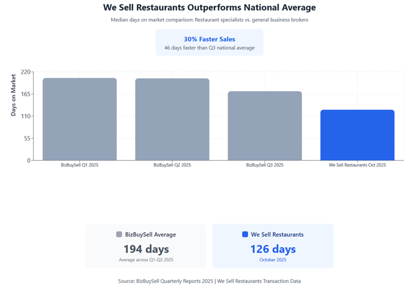 We Sell Restaurants outperformed the latest national average by 46 days, selling inventory 30% faster. This meaningful difference reflects the advantage of well-prepared listings combined with a specialized brokerage model focused exclusively on restaurants. General business brokers handle everything from dry cleaners to manufacturing operations. Restaurant-focused brokers understand the specific financial metrics, operational considerations, and buyer concerns that matter in this industry. That expertise translates directly into faster transactions.